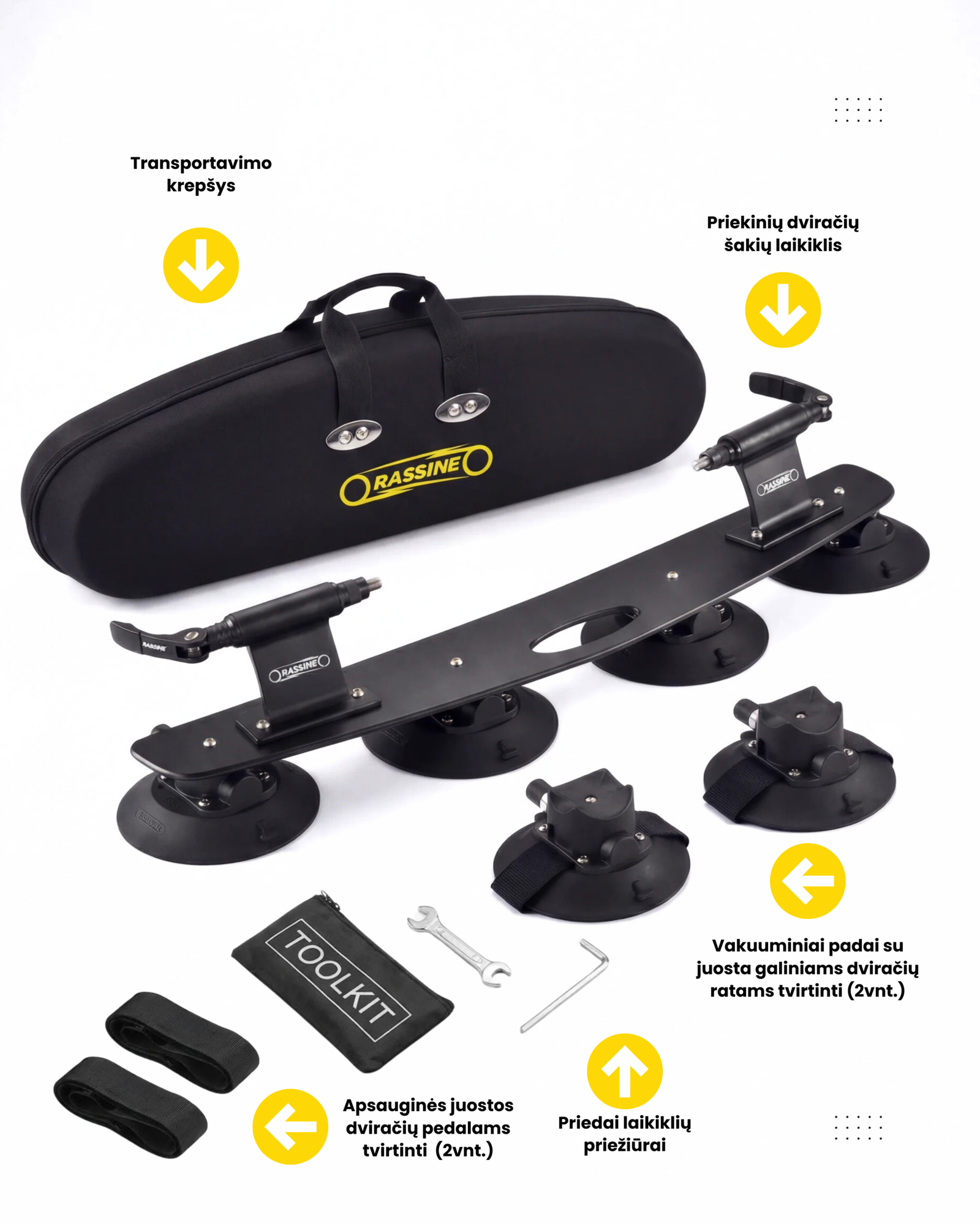 – Papildomų vakuuminių padų su juostomis galiniam dviračio ratui pritvirtinti.